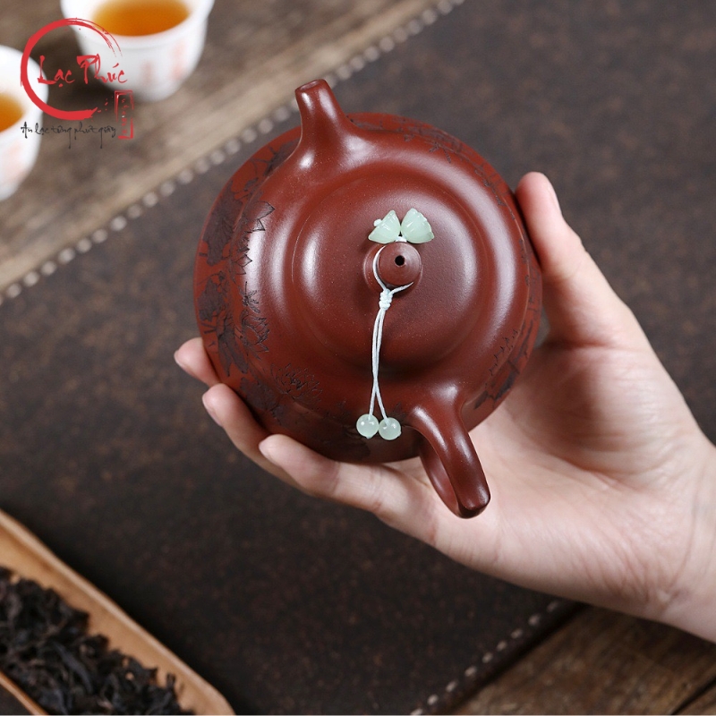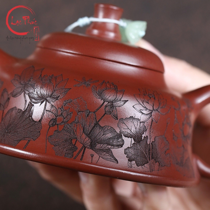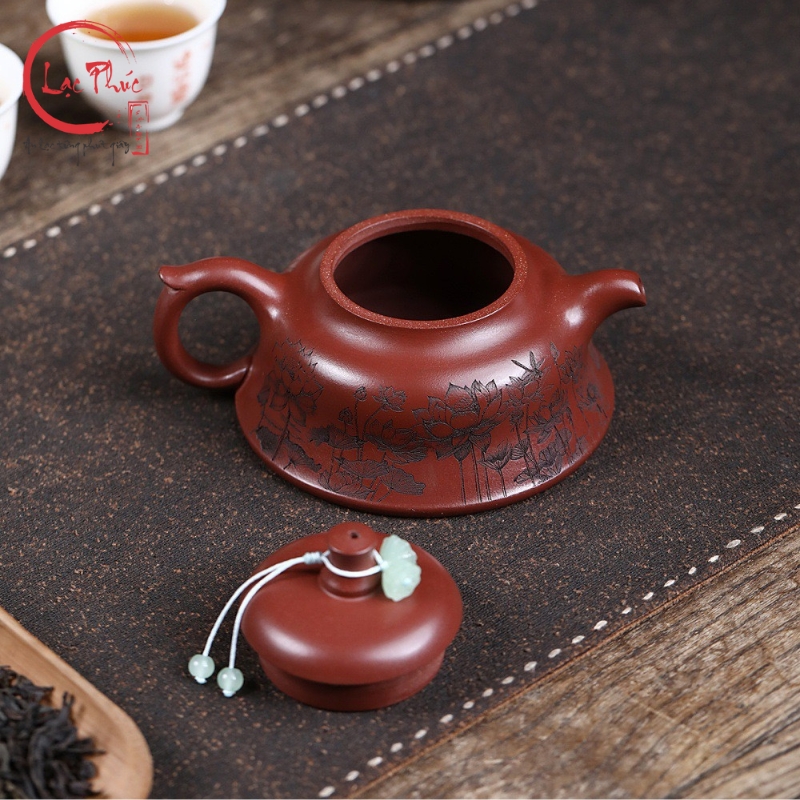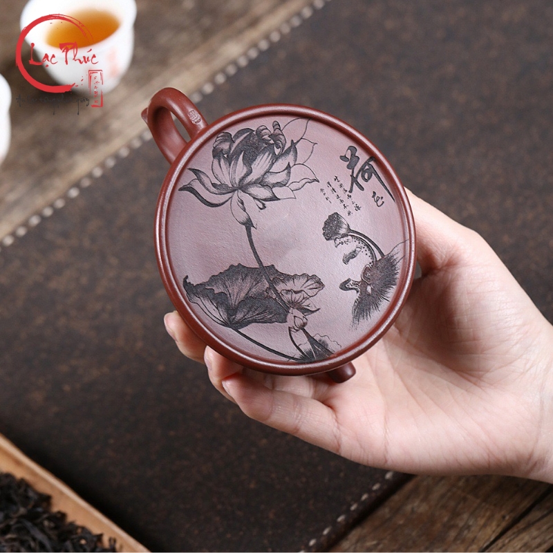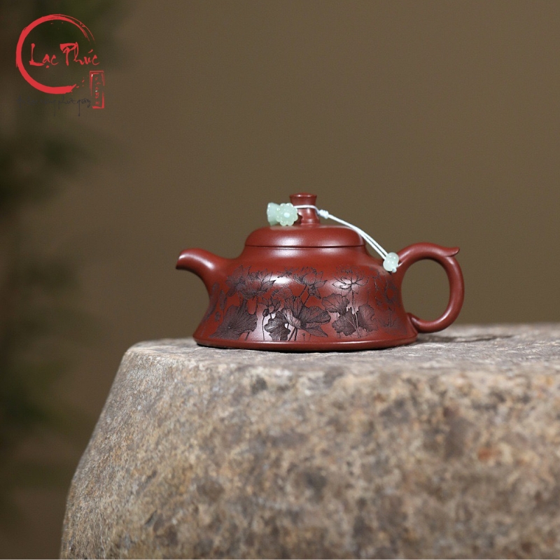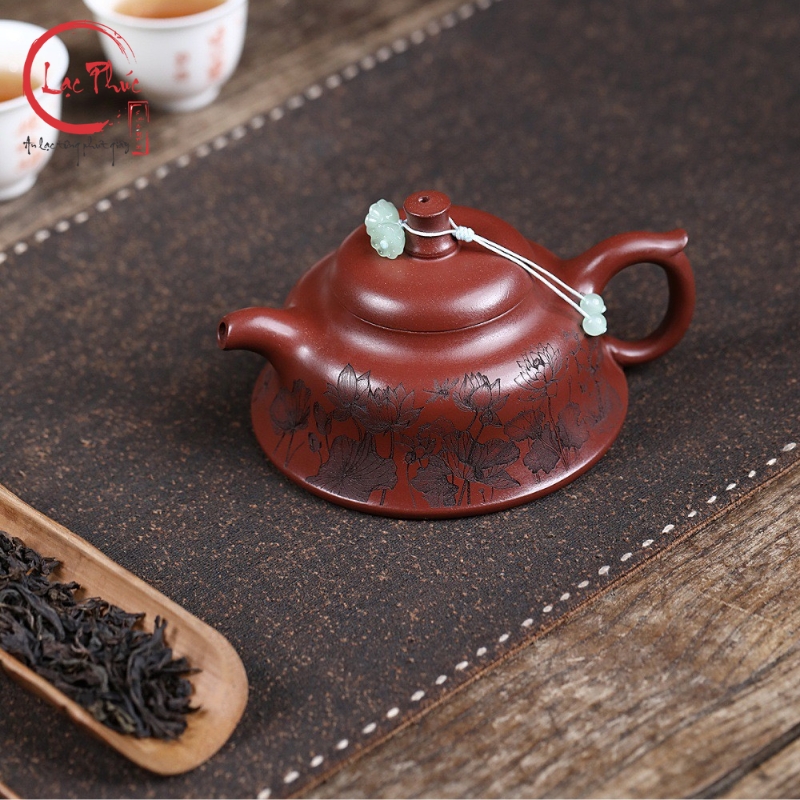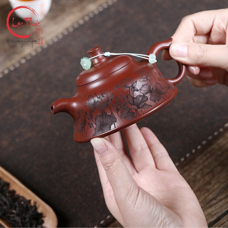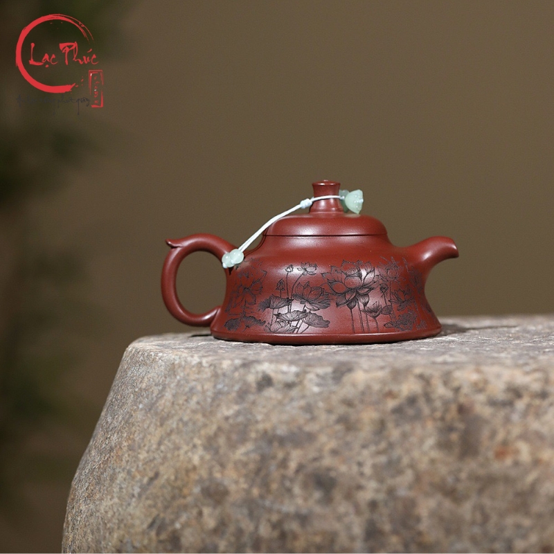Ấm tử sa đôn phúc tử gia nê khắc hoa sen đẹp 250ml ATS353-4 là mẫu ấm mang vẻ đẹp tĩnh tại và trang nhã, lấy cảm hứng từ hình tượng hoa sen biểu trưng cho sự thuần khiết và an nhiên. Dáng đôn phúc tròn đầy tạo cảm giác cân đối, chắc tay khi cầm nắm, đồng thời giúp ổn định nhiệt trong suốt quá trình pha trà. Chất tử gia nê cho sắc nâu tím trầm ấm, bề mặt mịn và đanh, kết hợp kỹ thuật khắc sen thủ công tinh tế mang đến chiều sâu thẩm mỹ và giá trị sử dụng lâu dài. Sản phẩm được Hội Quán Lạc Phúc tuyển chọn dành cho người yêu trà đề cao sự tinh giản và thanh sạch.