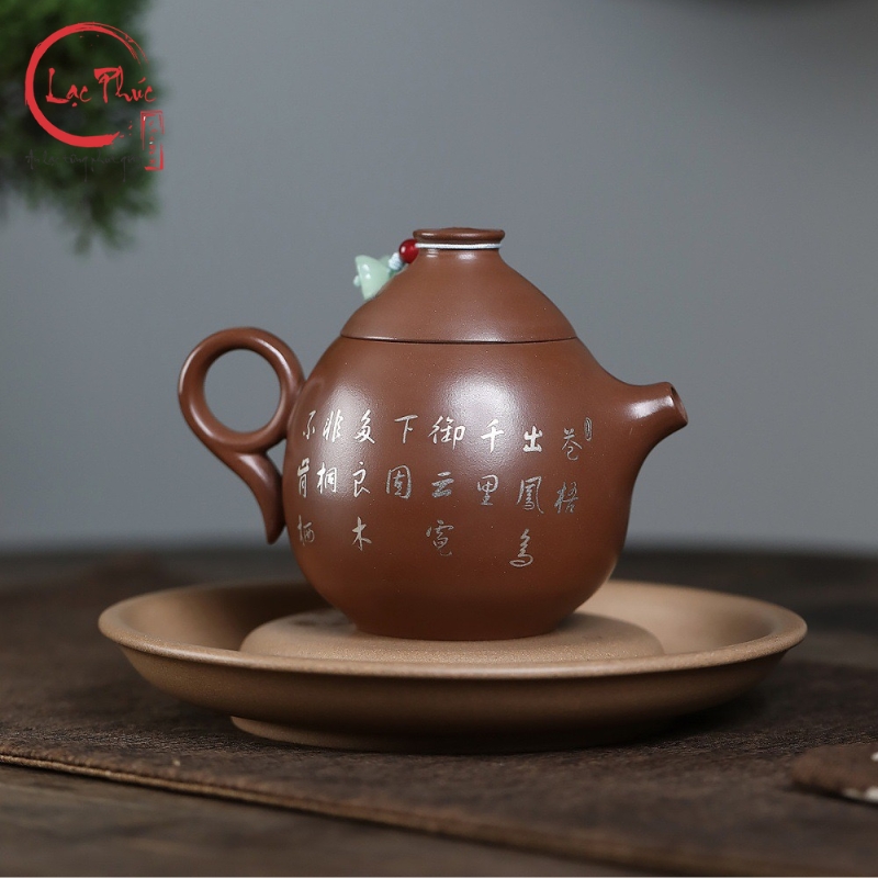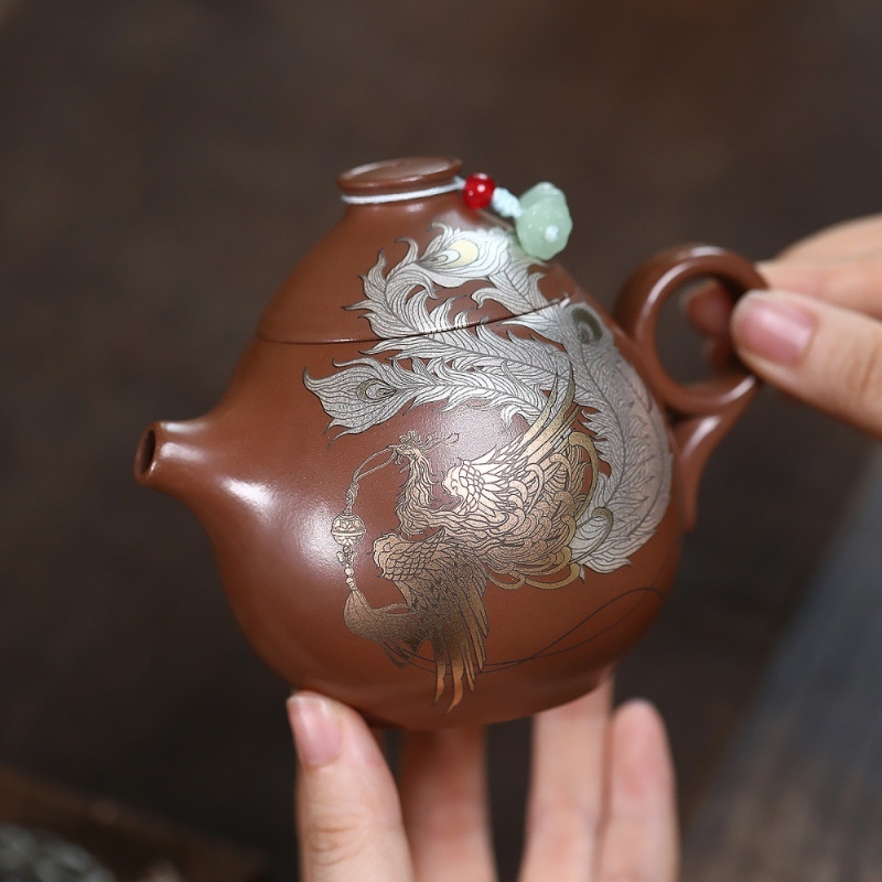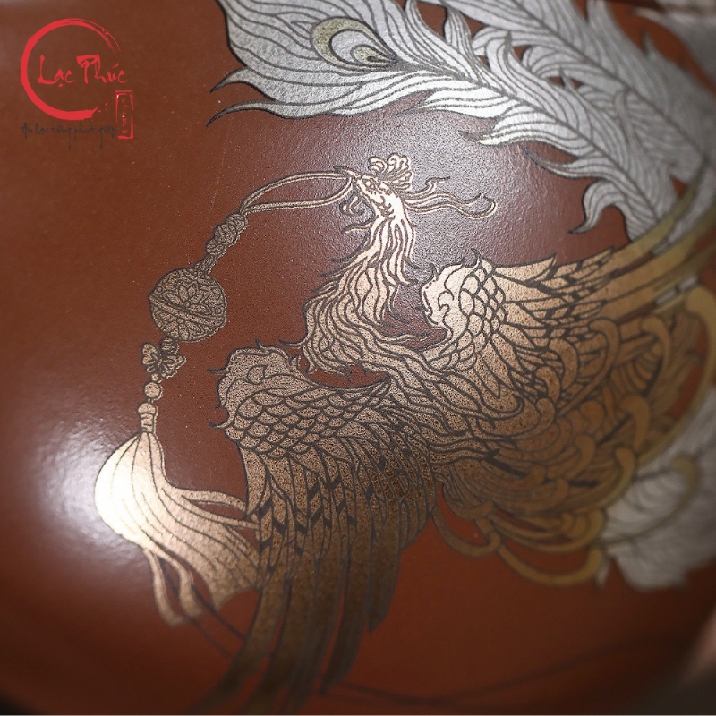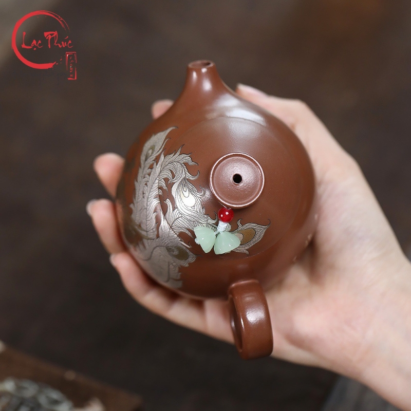 Ấm tử sa long đán tử gia nê vẽ Phượng Hoàng đẹp ATS485-1 mang dáng long đán cổ điển với thân tròn đầy, miệng ấm gọn và vai ấm bo mềm tạo cảm giác chắc tay khi cầm rót. Nước đất tử gia nê nâu trầm ấm làm nổi bật họa tiết Phượng Hoàng vẽ tay tinh xảo, đường nét uyển chuyển và giàu chiều sâu. Tổng thể ấm hài hòa giữa khí chất cao nhã và vẻ đẹp quyền quý, phù hợp không gian thưởng trà trang nhã và sưu tầm.