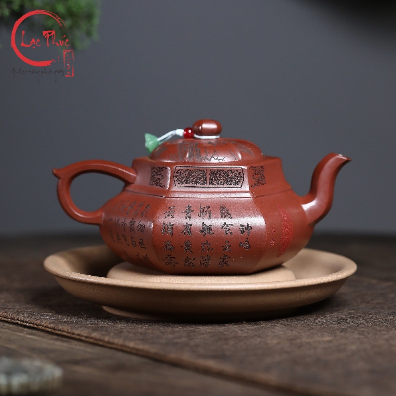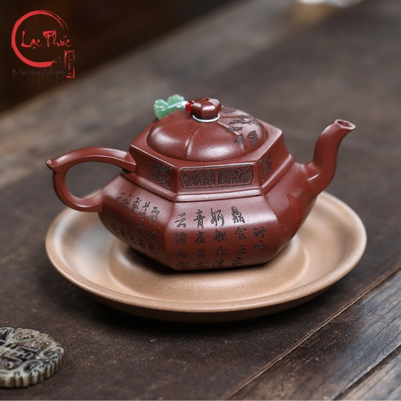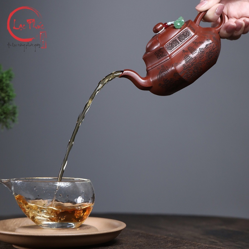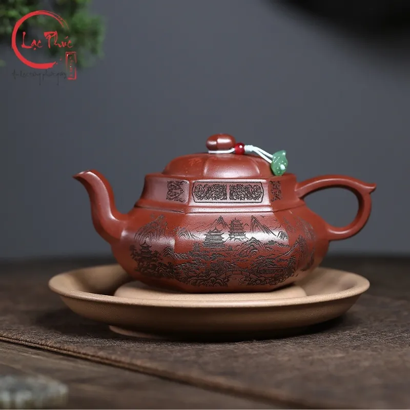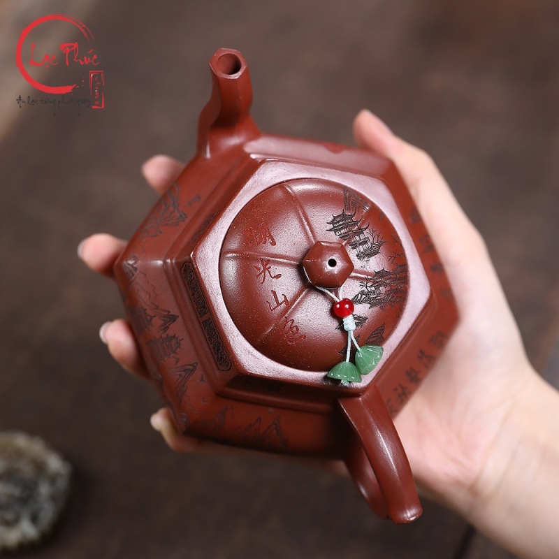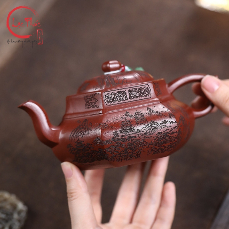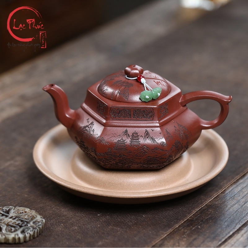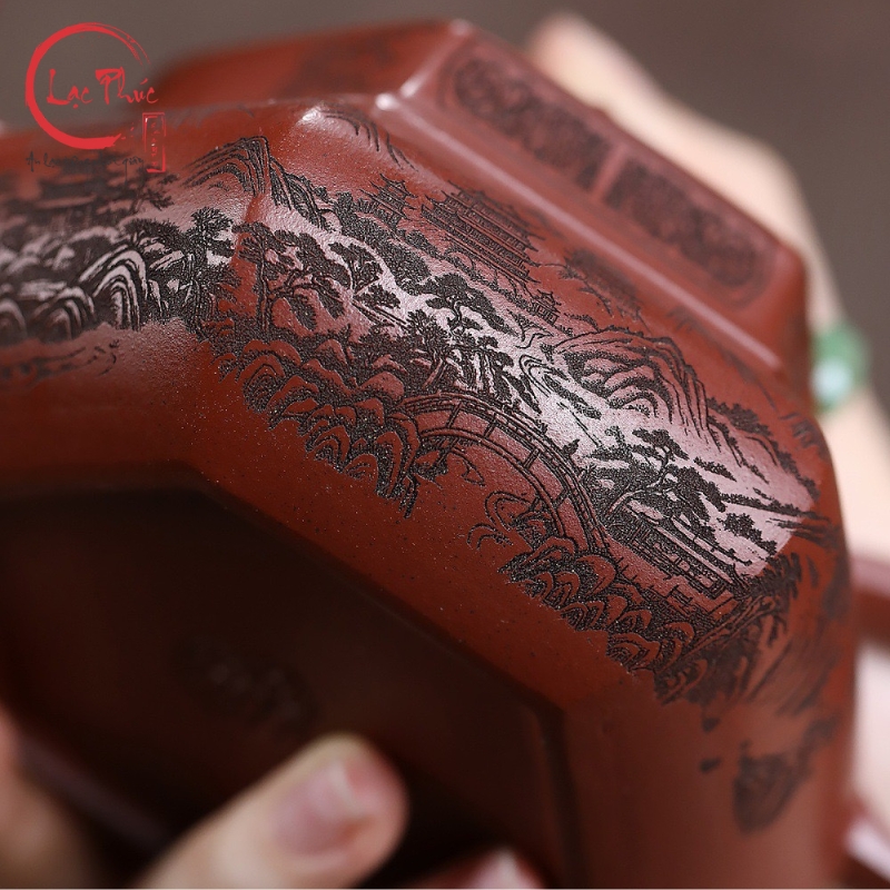 Ấm tử sa lục phương đại hồng bào khắc sơn thủy 300ml ATS487-2 là mẫu ấm mang vẻ đẹp mạnh mẽ và trang nghiêm, thể hiện rõ tinh thần hình khối trong nghệ thuật tử sa truyền thống. Dáng lục phương với các mặt phẳng rõ ràng tạo cảm giác vững chắc và cân đối, kết hợp nền đất đại hồng bào ánh đỏ trầm sang trọng. Họa tiết sơn thủy khắc tay bố cục khoáng đạt, đường nét sắc sảo, gợi không gian núi non tĩnh tại. Sản phẩm được Hội quán Lạc Phúc tuyển chọn và nhập khẩu trực tiếp từ Trung Quốc, phù hợp cho người yêu trà và sưu tầm ấm tử sa cao cấp.