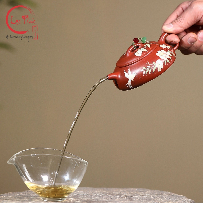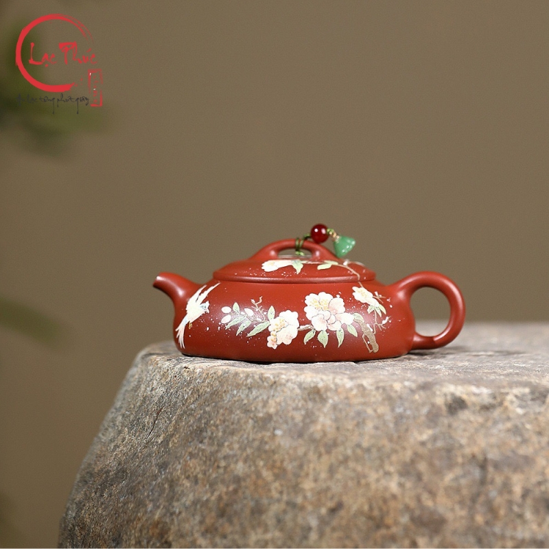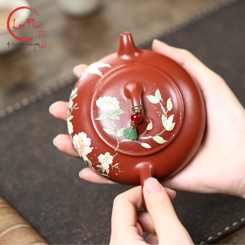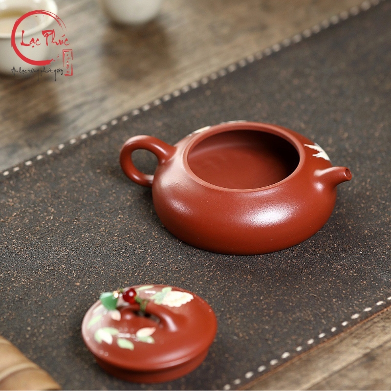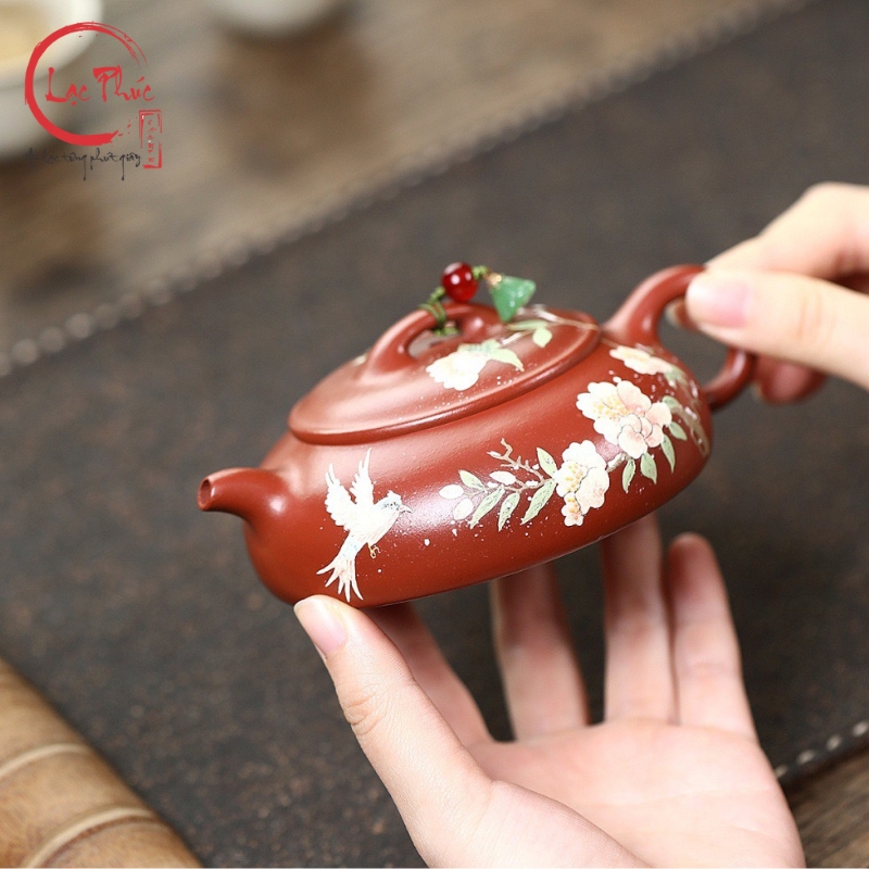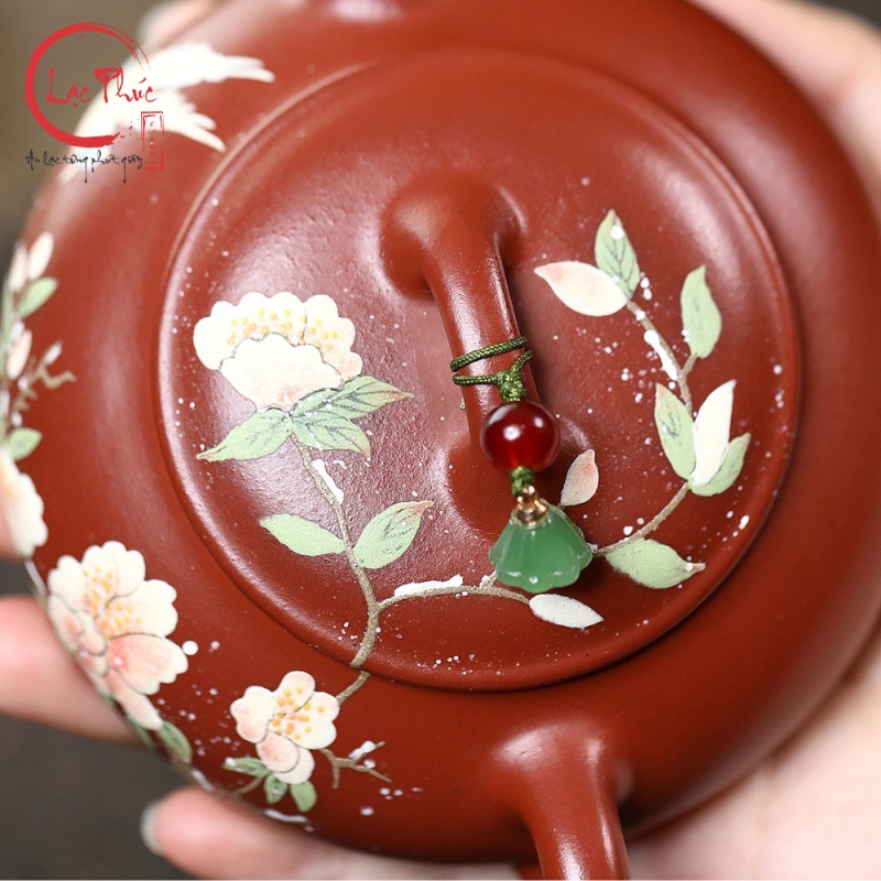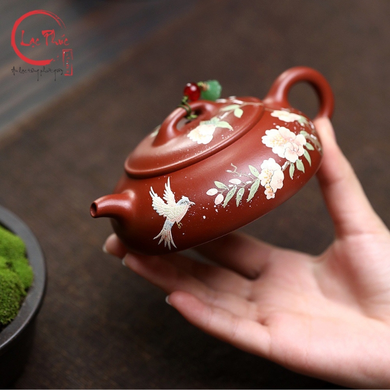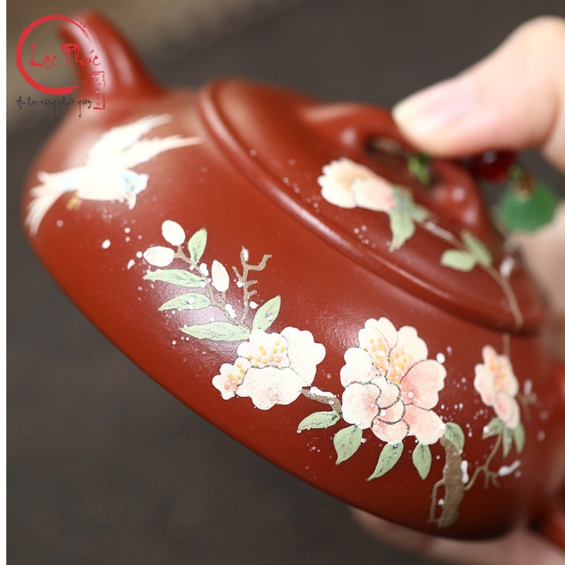 Ấm tử sa minh lư đại hồng bào vẽ hoa đẹp 200ml ATS486-1 là mẫu ấm mang phong cách nhã nhặn, mềm mại nhưng vẫn giữ được thần thái cổ điển của nghệ thuật tử sa. Dáng minh lư thấp, thân dẹt, cân đối giúp thao tác rót trà ổn định và êm tay. Nền đất đại hồng bào ánh đỏ trầm kết hợp họa tiết hoa vẽ tay cùng chim bay tạo cảm giác sinh động, thanh thoát và hài hòa. Sản phẩm được Hội quán Lạc Phúc tuyển chọn và nhập khẩu trực tiếp từ Trung Quốc, phù hợp cho người yêu trà tinh tế và sưu tầm ấm thủ công.