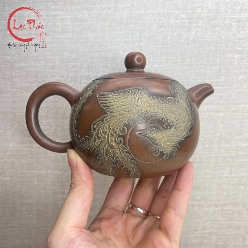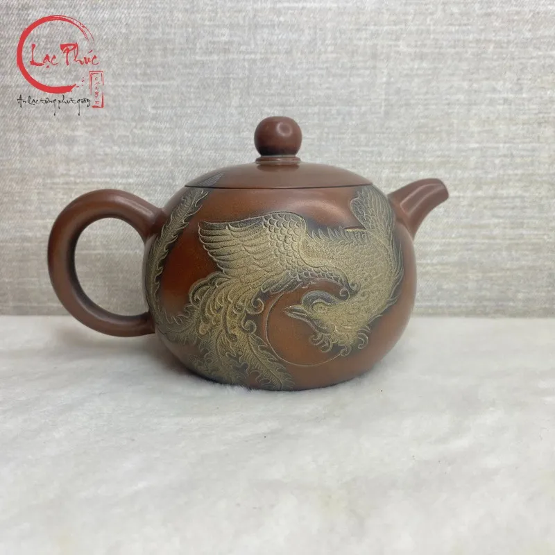 Ấm Tử Sa Tây Thi Khắc Phượng Hoàng Đẹp 200ml ATC122 là sự kết hợp hoàn hảo giữa dáng ấm mềm mại, thanh thoát và họa tiết phượng hoàng khắc nổi thủ công tượng trưng cho sự cao quý, may mắn và thịnh vượng. Mỗi đường khắc được nghệ nhân thể hiện tinh tế, tạo nên vẻ đẹp sống động và sang trọng. Được chế tác từ đất tử sa nguyên khoáng tự nhiên, sản phẩm mang đến khả năng giữ nhiệt tuyệt vời, giúp trà đậm vị và lưu hương lâu. Đây là mẫu ấm được Hội Quán Lạc Phúc tuyển chọn dành cho người yêu trà đạo và nghệ thuật tử sa.