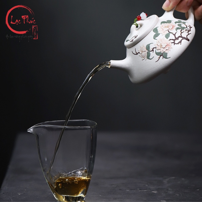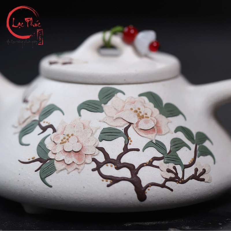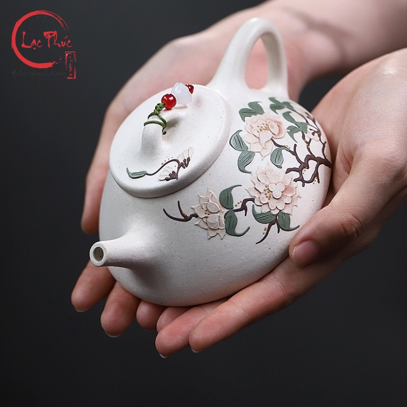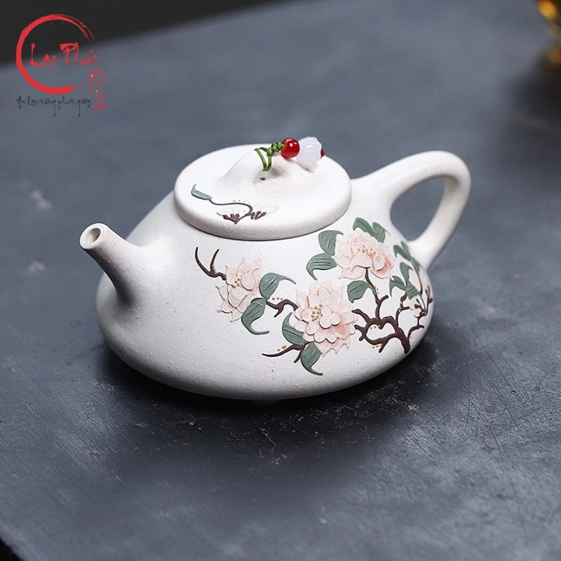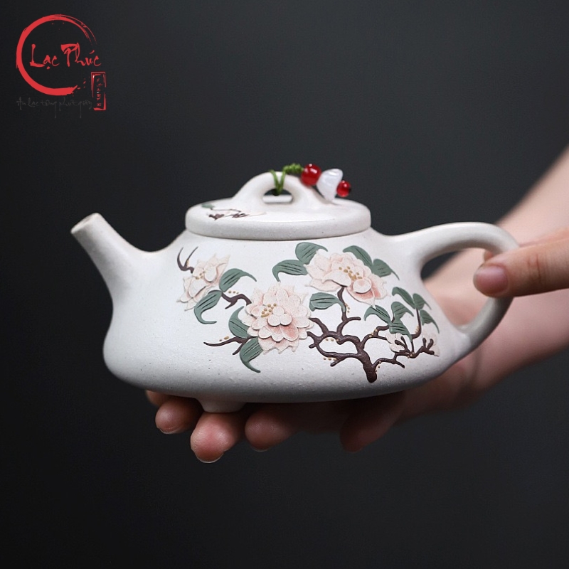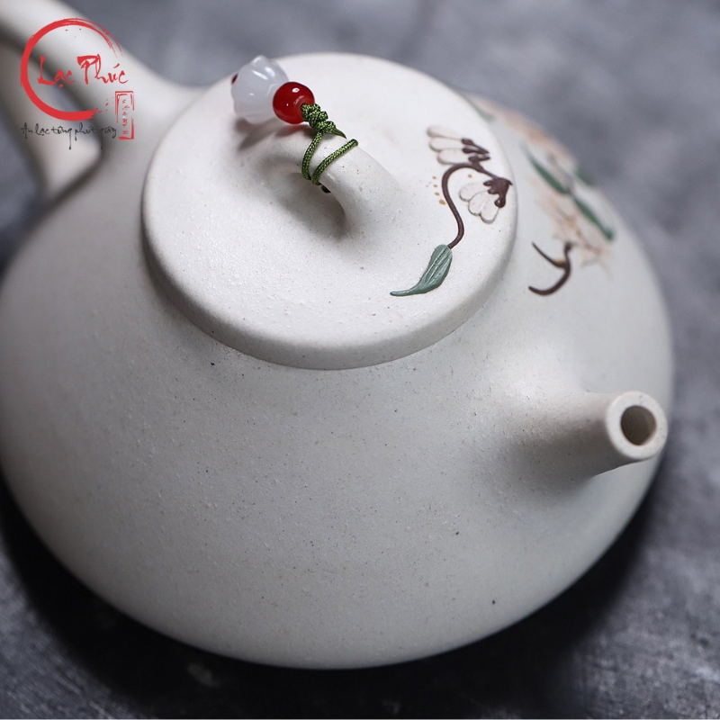 Ấm tử sa thạch biểu bạch nê vẽ hoa mẫu đơn đẹp 240ml ATS421-2 là mẫu ấm mang vẻ đẹp thanh khiết và sang nhã, nổi bật với sắc bạch nê sáng mịn hiếm gặp trong các dòng tử sa. Dáng thạch biểu cổ điển, thân thấp và chắc giúp giữ nhiệt ổn định, phù hợp nhiều dòng trà. Điểm nhấn nghệ thuật nằm ở hoa mẫu đơn vẽ tay, biểu trưng cho phú quý, cát tường và sự viên mãn. Từng nét vẽ được thể hiện thủ công tỉ mỉ, hài hòa với nền đất trắng ngà, tạo nên tổng thể trang nhã và tinh tế. Sản phẩm được Hội Quán Lạc Phúc tuyển chọn dành cho người yêu trà đề cao thẩm mỹ và sự nhẹ nhàng trong thưởng trà.