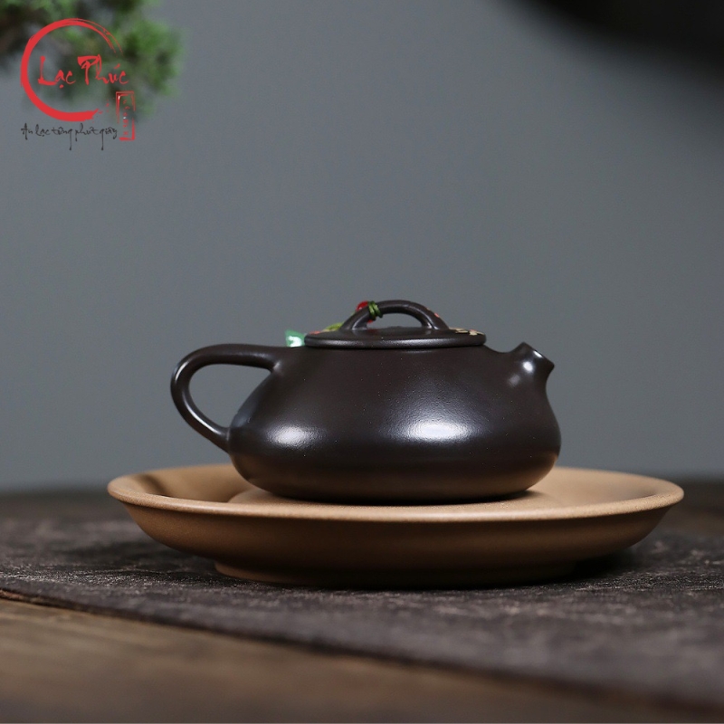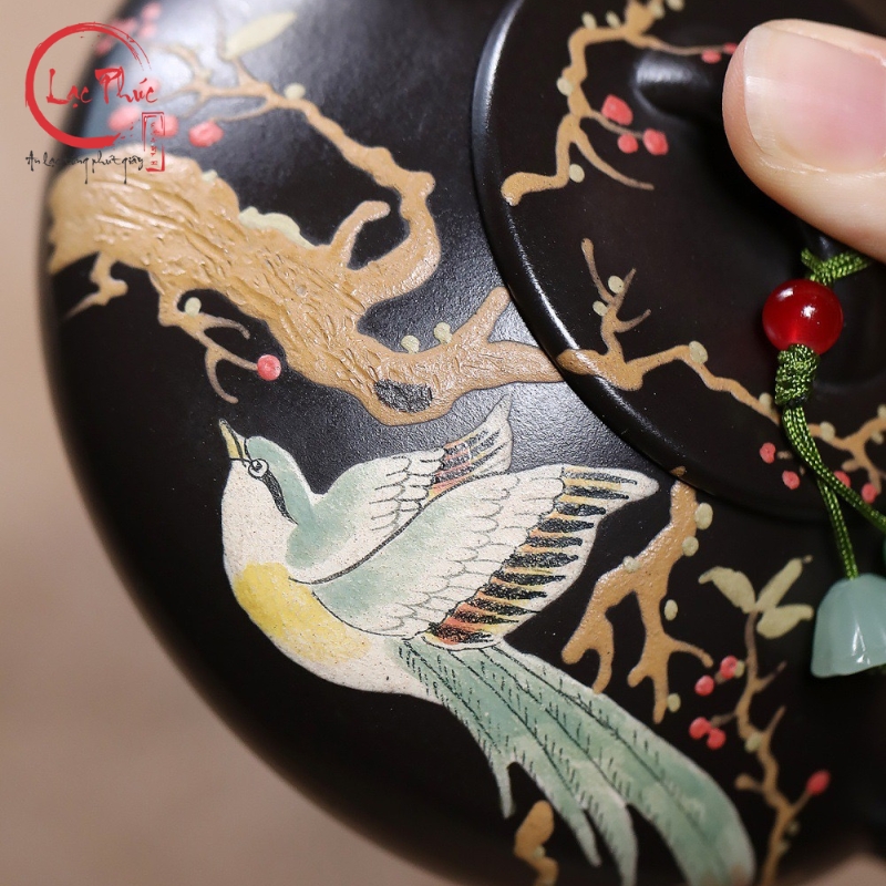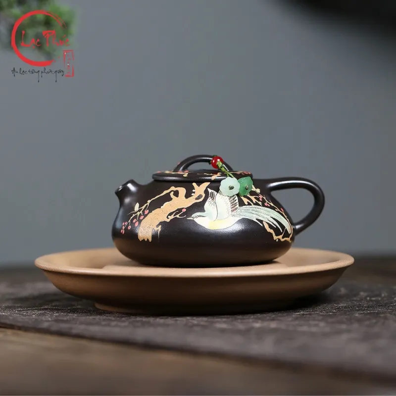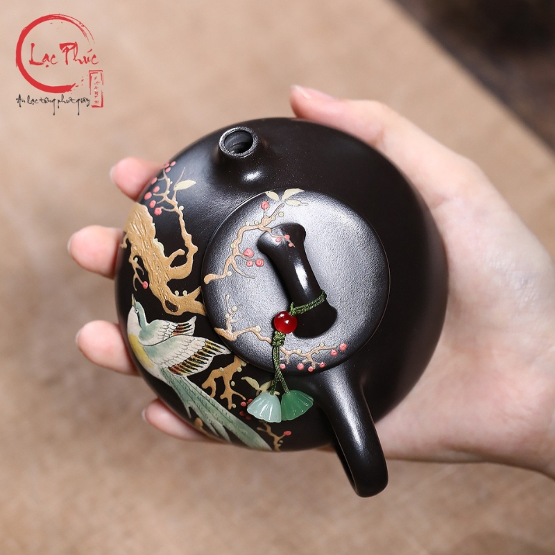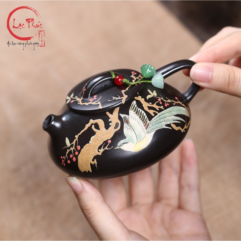 Ấm tử sa thạch biều hắc nê vẽ chim 200ml ATS225-2 là mẫu ấm mang vẻ đẹp hài hòa giữa tạo hình cổ điển và nghệ thuật hội họa tinh tế. Dáng thạch biều vững chãi, cân đối kết hợp cùng đất hắc nê cho sắc trầm sâu, cảm giác đầm tay và giữ nhiệt ổn định. Họa tiết chim vẽ tay mềm mại, sinh động, gợi sự tự tại và thanh nhã trong không gian trà đạo. Sản phẩm được chế tác thủ công toàn bộ, phù hợp cho người yêu trà muốn tìm một chiếc ấm vừa chuẩn công năng vừa giàu giá trị thẩm mỹ, do Hội Quán Lạc Phúc tuyển chọn.