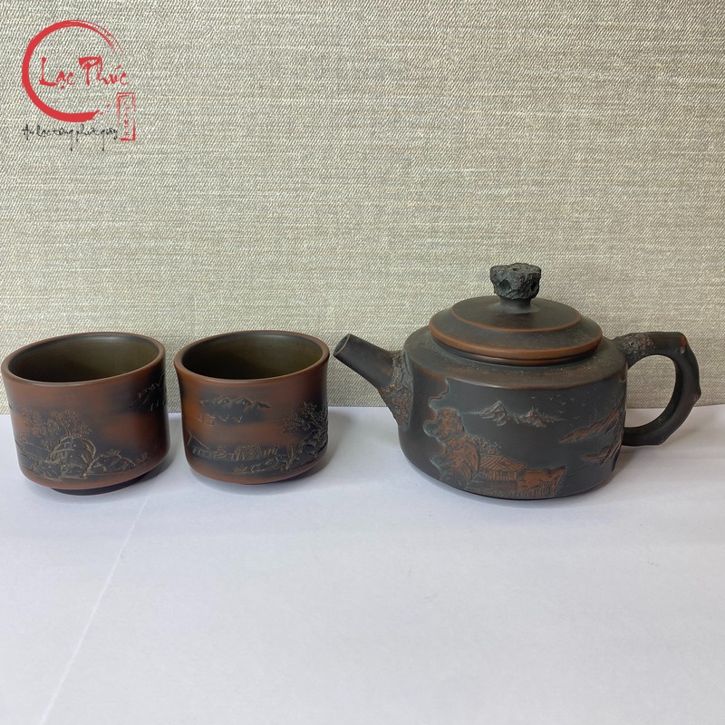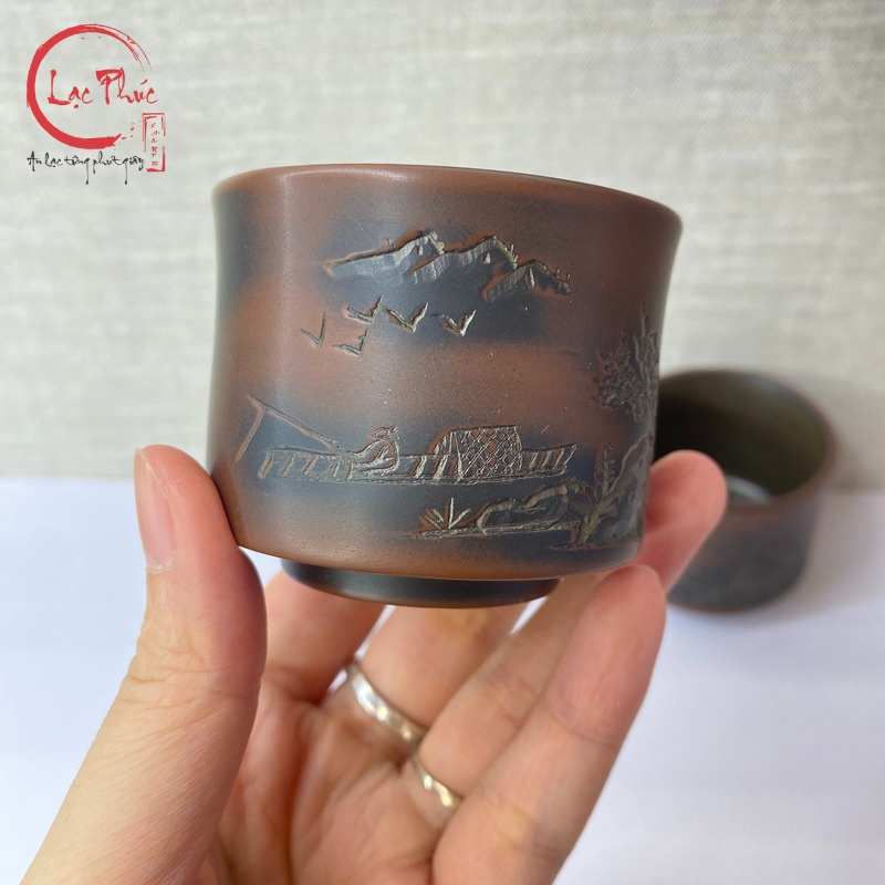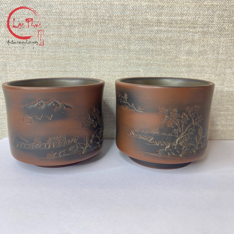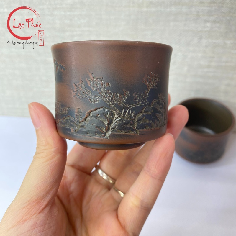 Chén trà tử sa khắc sơn thủy 50ml đẹp CNH25-3 là phụ kiện thưởng trà mang vẻ đẹp trầm tĩnh và tinh tế, phù hợp đồng bộ với các bộ ấm tử sa nghệ nhân. Chén được làm từ đất tử sa nguyên khoáng, có độ thoáng khí tự nhiên giúp giữ hương trà và làm vị thêm sâu đậm theo từng lần rót. Họa tiết sơn thủy khắc nổi được nghệ nhân thể hiện bằng nét chạm mềm mại, tạo cảm giác an nhiên và thư thái. Đây là mẫu chén được Hội Quán Lạc Phúc tuyển chọn dành cho người yêu trà đạo và không gian thưởng trà cổ điển.