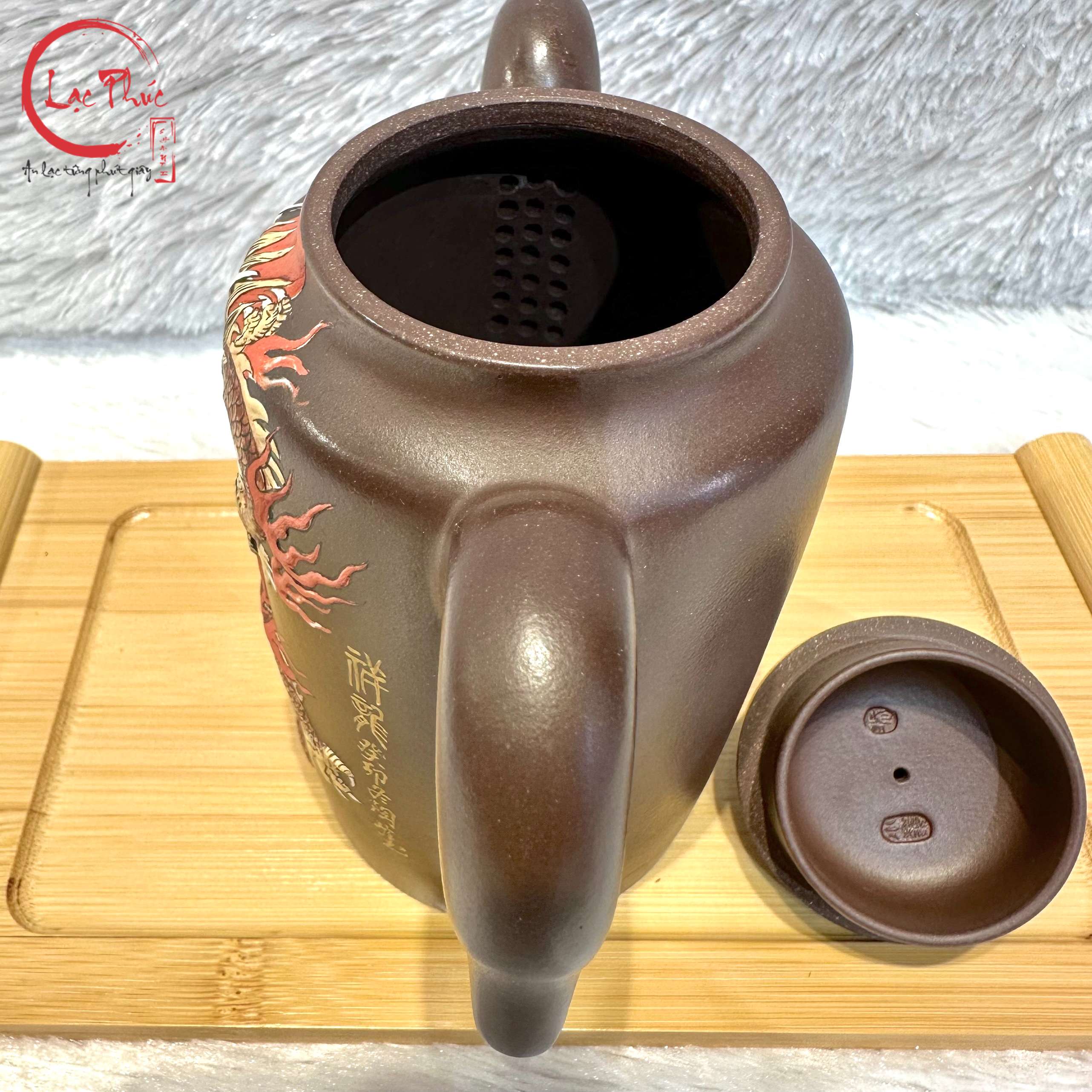 Ấm tử sa dáng tập tư hồ, một dáng ấm khó khi thực hiện, nguyên khoáng lão Đáy Tào Thanh hiếm, 440cc, nghệ nhân nổi tiếng Tao Ling. Thân dáng chiếc ấm mang ý nghĩa thăng hoa, sự nghiệp thuận lợi, cũng có nghĩa là chúc phúc cho hòa bình và cuộc sống hạnh phúc. Mặt trước của ấm được vẽ hoàn toàn hình Tường Long tốt lành uy nghiêm và quyết đoán. Sự kết hợp giữa Tường Long và những đám mây tốt lành tượng trưng cho sự may mắn và thịnh vượng , đồng thời cũng tượng trưng cho sự thăng tiến và giàu có. Rồng tượng trưng cho quyền lực, sự cao quý, danh dự và còn là biểu tượng của sự may mắn, thành công..